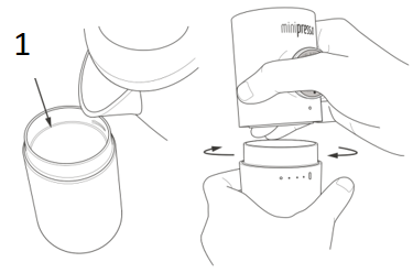 Napolnite rezervoar za vodo glede na tveganje. Poravnajte ohišje vašega MiniPresso s piko na rezervoarju in ga namestite na rezervoar tako, da ga obrnete v smeri urinega kazalca.